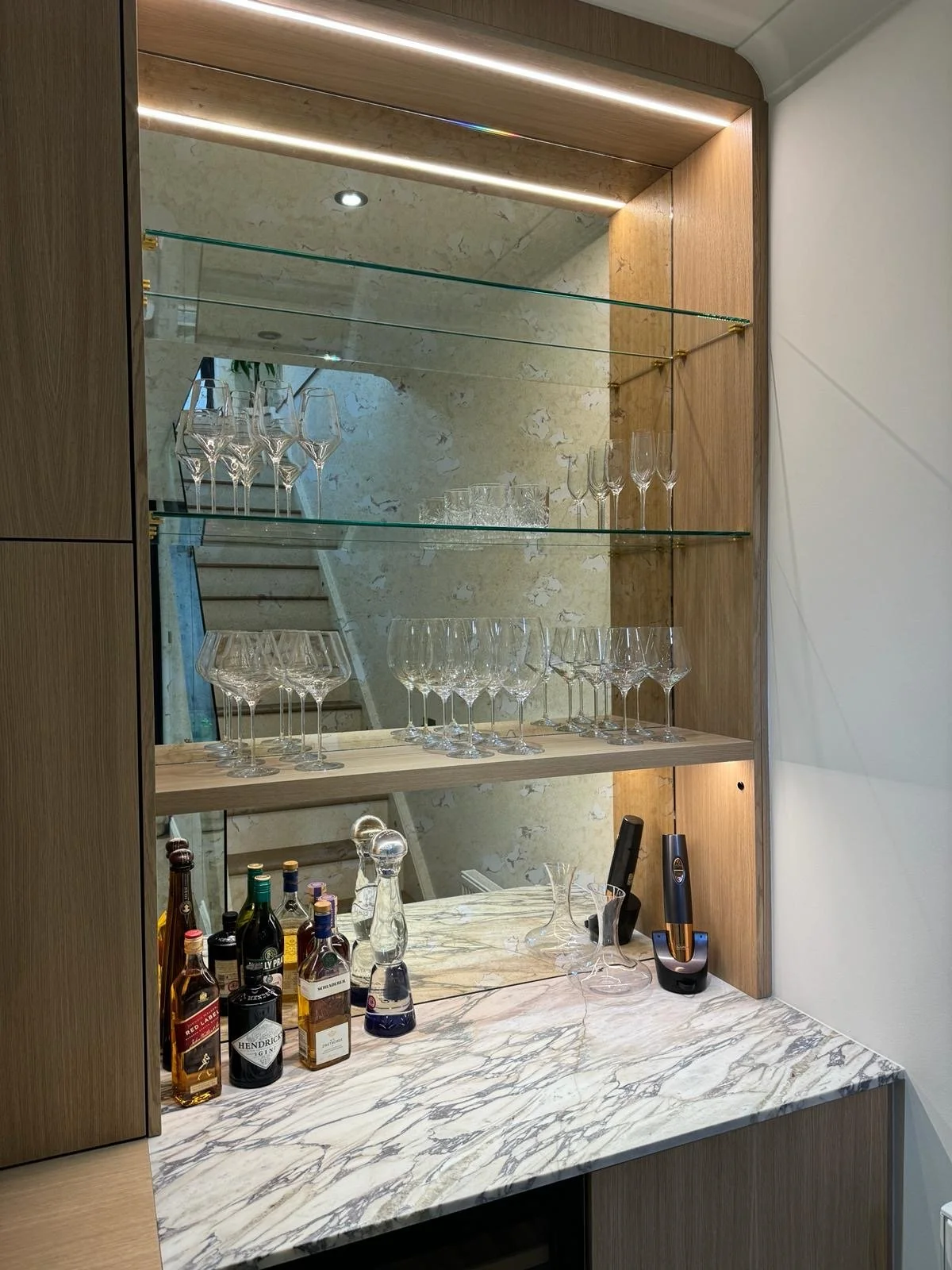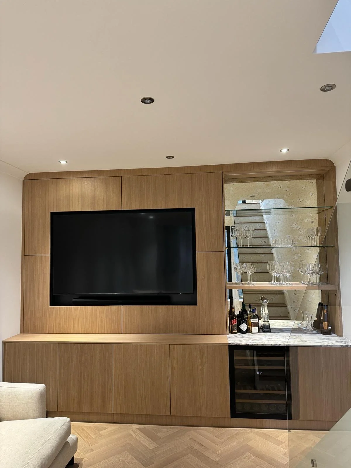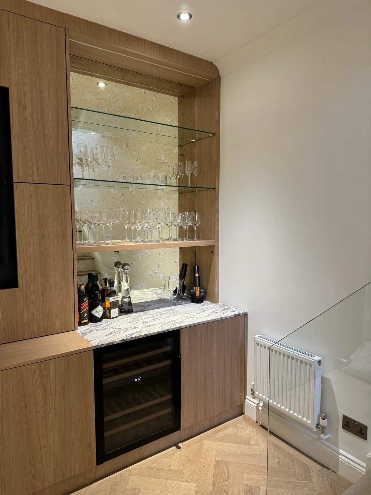 In Kensington, we took on a joinery project where we upgraded the kitchen (you can see it in our portfolio) and also created a TV unit, built-in bar, shelves in alcove units and wardrobes. For a consistent aesthetic, we used a combination of stained oak veneer and striking Viola marble across all pieces. The built-in bar features a wine fridge, distressed mirror, and illuminated glass shelves, adding both functionality and style to the space